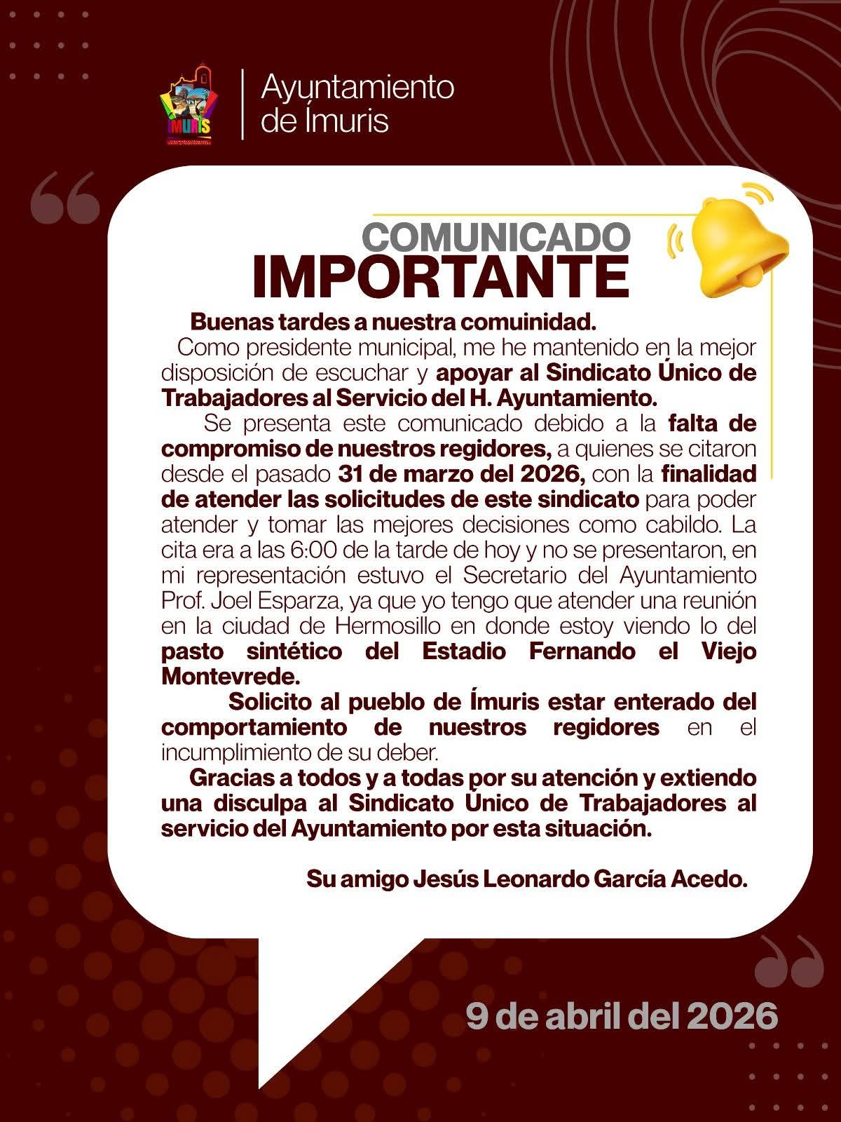 Ímuris, Sonora a 09 de abril de 2026.- Este jueves, trabajadores del Ayuntamiento de Ímuris, a través de la Mesa Directiva del Sindicato Único de Trabajadores al Servicio del Ayuntamiento, tenían agendada una reunión de atención con el Alcalde Jesús Leonardo García Acedo, cita a la cual el munícipe nunca llegó, ni tampoco notificó previamente a sus trabajadores sobre su ausencia.