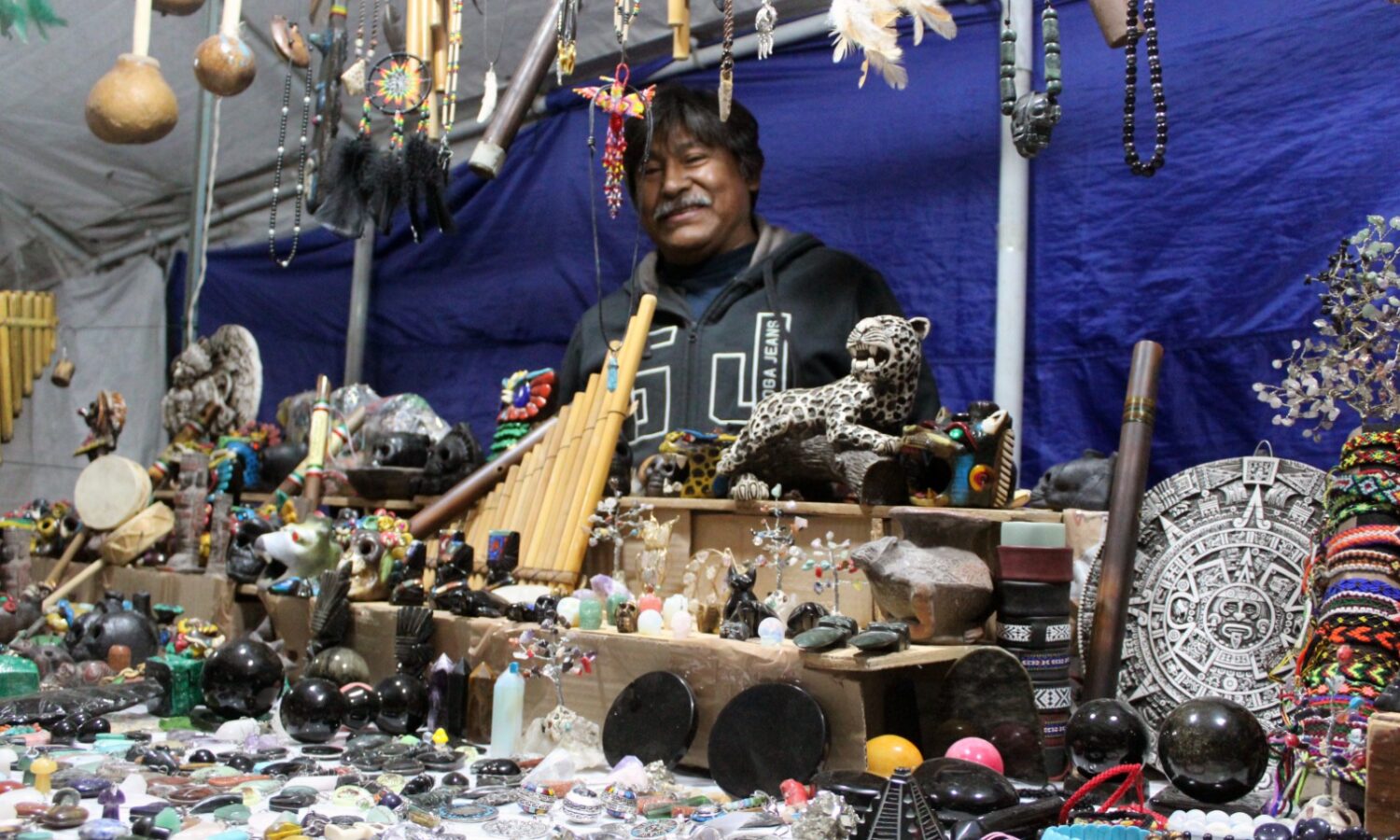 Avanzando en el recorrido por la Plaza Juárez, se encuentra el místico puesto de Santiago Reyes del estado de Hidalgo con artesanías relacionadas a la cultura tolteca, tiene artefactos que emiten sonidos que antes eran utilizados para comunicarse, como el del águila, jaguar, cenzontle, el de la llorona y el grito azteca de la muerte, además de cuarzo, bisutería e instrumentos andinos.